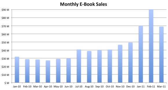 Fresh off impressive all-time high sales of $90.3M in February (which made them the highest-grossing format, ahead of hardcovers and trade paperbacks), e-book sales settled down to a more reasonably robust $69.0M for March of 2011. That’s very close to January’s $69.9M. As compared to March 2010, the March 2011 numbers are an increase of 142%.
